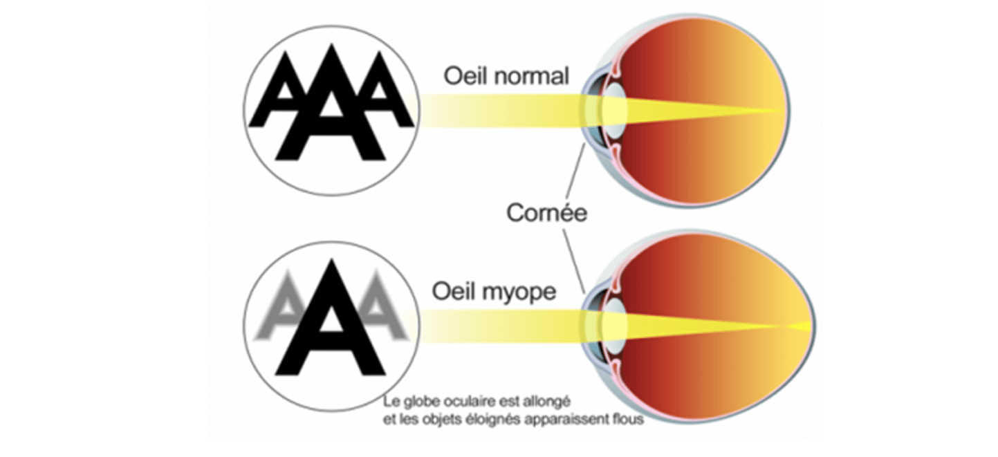 La myopie axiale (la plus fréquente) traduit l’allongement du globe et donc la focalisation de l’image en avant de la rétine, résultant en un flou visuel. Le patient doit alors rapprocher les objets pour les voir nets ou porter des corrections qui reculent le point de focalisation sur la rétine. Dans certains cas, ce n’est pas la longueur de l’œil qui est responsable de la myopie, mais la courbure de la cornée, trop cambrée.